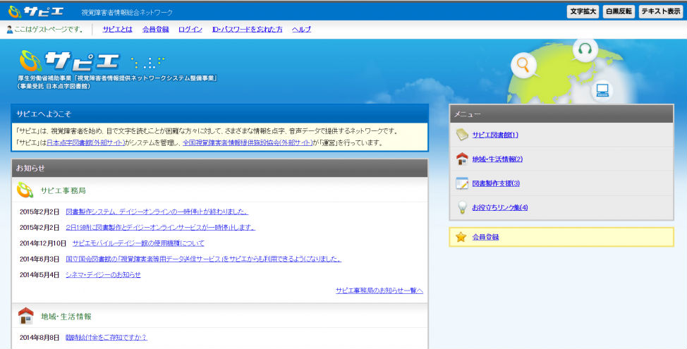 全国視覚障害者情報提供施設協会が運営する視覚障害者情報総合ネットワーク「サピエ」には、全国の加盟施設が保有する点字図書、録音図書、録音雑誌などのデータが掲載されています。「サピエ」は、個人利用も可能です。視聴覚センターを通して「サピエ」に利用登録されれば、「サピエ」に掲載されている膨大な数の図書や雑誌のデータの中から、ご自分が欲しいものをパソコンなどでダウンロードして、すぐに利用することができます。