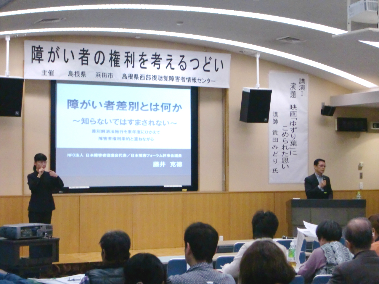 次の講演は、日本障害者協議会の代表で視覚に障がいのある藤井克徳さんに、「障がい者差別とは何か~知らないではすまされない~」と題してお話しいただきました。